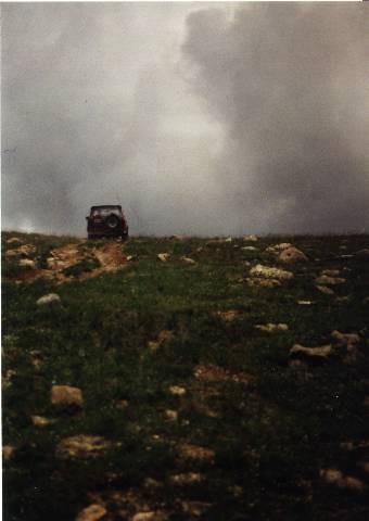 Willy's red SSII is on the left, with my grey '77 to it's right, and an unfinished yellow 800 to the right of my Scout. Looking in the background, you can notice that the storm clouds were already brewing.